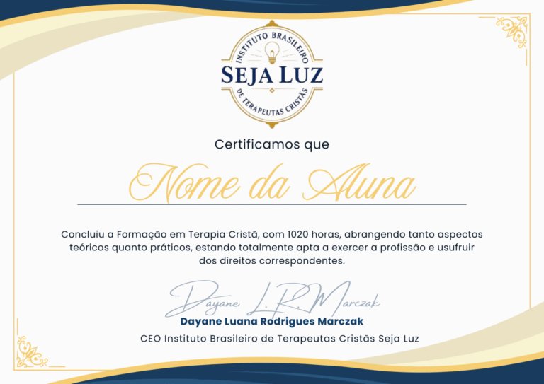 Ao concluir o curso e atingir pelo menos nota 70 nas avaliações, você receberá 2 (dois) certificados como Terapeuta Cristã. É necessário concluir 100% do curso para solicitar os certificados.